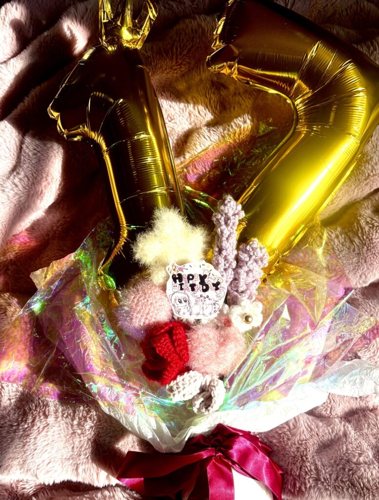 ただ編もうかなと決めたのが、誕生日の2週間前でしたので小さい花束にすることにしました。