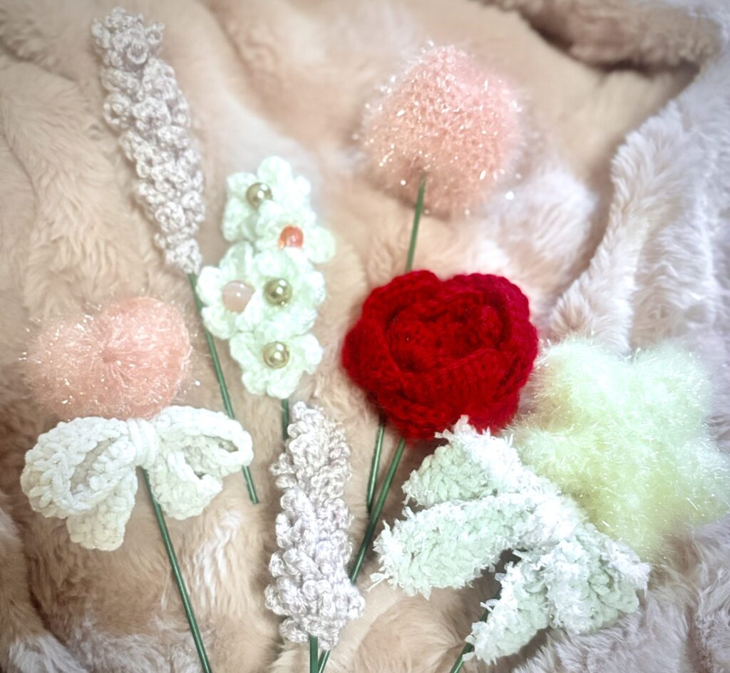 花は薔薇と、編みたいと思った物を編もう思いましたが、全てが強調しあうと花束のバランスが悪くなるかな?と思い何個かは添えるための花も考えました。